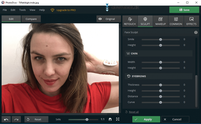 PhotoDiva er et flot program med en brugerflade, der hurtigt lader dig få styr på de forskellige features. De er kategoriseret i det højre tophjørne, hvor du har fem forskellige knapper. Her er f.eks. “Sculpt”, hvor du kan ændre dimensionerne på dit ansigt med en masse forskellige sliders som var det et Sims spil.