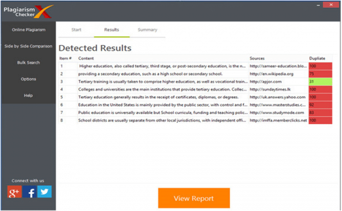 En stor fordel er de farvekodede rapporter, som gør det nemt at se præcis hvilke tekststykker, der er unikke, delvist kopierede eller helt identiske.
