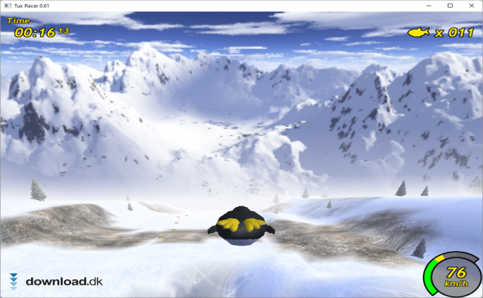 Glid gennem bjerge belagt af sne og is i Tux Racer til Windows og Linux, som du kan downloade gratis!